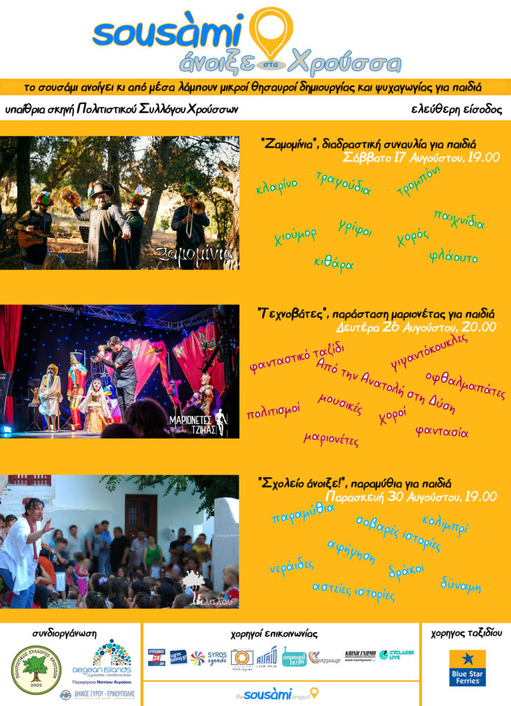 Φέτος, ξεκινάει το φεστιβάλ «Σουσάμι, άνοιξε! στα Χρούσσα», με τη συνδιοργάνωση του Δήμου Σύρου-Ερμούπολης και της Περιφέρειας Νοτίου Αιγαίου. Το Φεστιβάλ πηγάζει και υποστηρίζεται από το «the sousàmi project» της Εν.Το.Πο.Σύρο, που έχει αναλάβει την εκτέλεση παραγωγής.