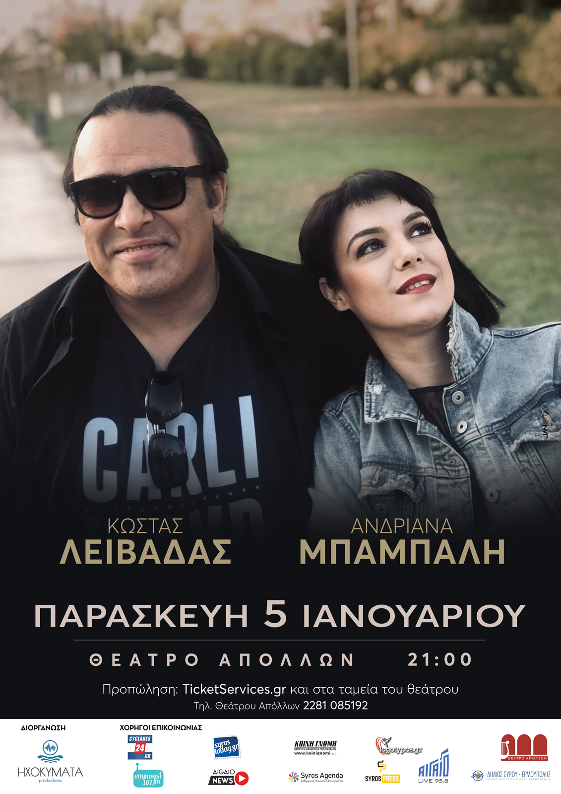 Προπώληση εισιτηρίων: https://www.ticketservices.gr/event/kostas-leivada-andriana-mpampali-syros/ και στα ταμεία του θεάτρου.