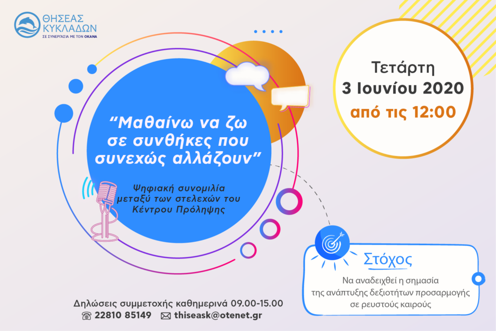 Το Κέντρο Πρόληψης των Εξαρτήσεων και Προαγωγής της Ψυχοκοινωνικής Υγείας «ΘΗΣΕΑΣ ΚΥΚΛΑΔΩΝ» δύο μήνες μετά τις μεγάλες αλλαγές, που έφερε στην καθημερινότητα μας η συνθήκη της πανδημίας, θεώρησε σημαντική τη δημιουργία ασφαλών πλαισίων, όπου οι άνθρωποι θα μπορέσουν να εκφράσουν και να επεξεργαστούν συναισθήματα, σκέψεις και προβληματισμούς και μέσα από το μοίρασμα να βγουν περισσότερο […]