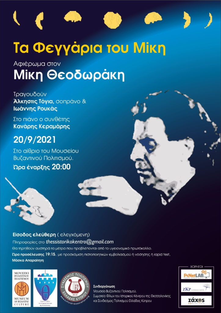 Το Μουσείο Βυζαντινού Πολιτισμού φιλοξενεί στον αίθριο χώρο του ένα μουσικό αφιέρωμα στον Μίκη Θεοδωράκη την Δευτέρα 20 Σεπτεμβρίου 2021, με τίτλο “Τα φεγγάρια του Μίκη”. Η βραδιά διοργανώνεται σε συνεργασία με το Σωματείο Φίλων Ιστορικού Κέντρου Θεσσαλονίκης και ο Σύνδεσμος Πολιτισμού Ελλάδας Κύπρου. Συμμετέχουν: Στο τραγούδι η Άλκηστις Τόγια, σοπράνο και ο Ιωάννης Ρουκάς […]